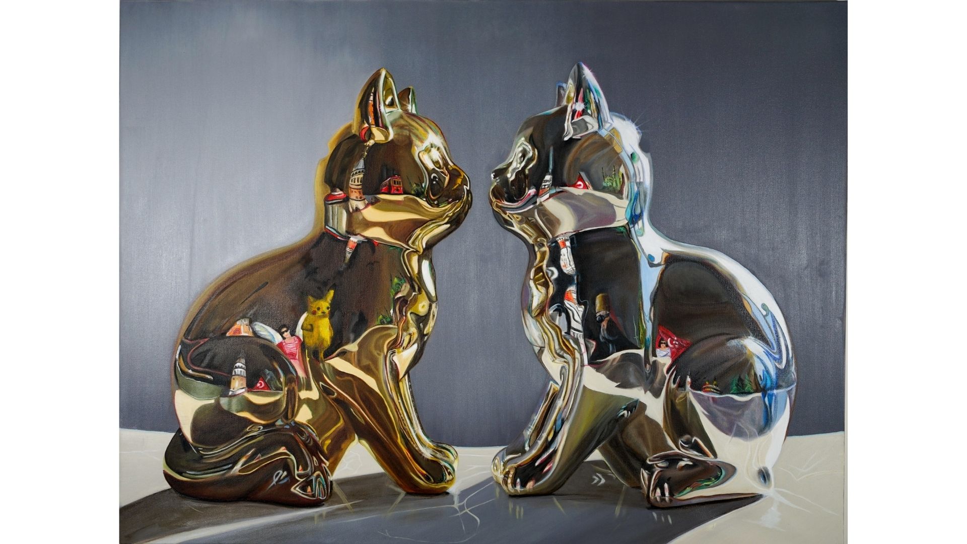 Altın rengi sıklıkla kullanmam bilinçli bir tercih. Altın, hem simyayı hem de insanın öz değerini temsil ediyor. Yansıma ise yüzleşmeyi ve dönüşümü. Görünenin ötesinde, daha derin ve çoğu zaman görünmeyen katmanların varlığına işaret ediyor. Tuval üzerine yağlıboya ve/veya akrilik ile çalışıyorum. Akışkan formlar, damlayan yüzeyler, eriyen ya da dönüşen imgeler ise sabit olmayan kimliği ve sürekli değişen varoluşu anlatıyor.