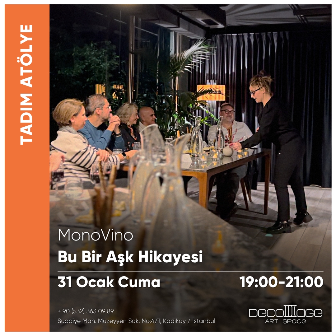 Tiyatro ve şarap tadımını bir arada sunan “MonoVino Bu Bir Aşk Hikayesi” küçük gruplara özel bir tadım etkinliğidir. Bu atölyemizde 3 farklı şarap ve peynir tadımı eşliğinde tek kişilik interaktif bir tiyatro performansı izliyor, şarapların hikayelerine ortak oluyorsunuz.