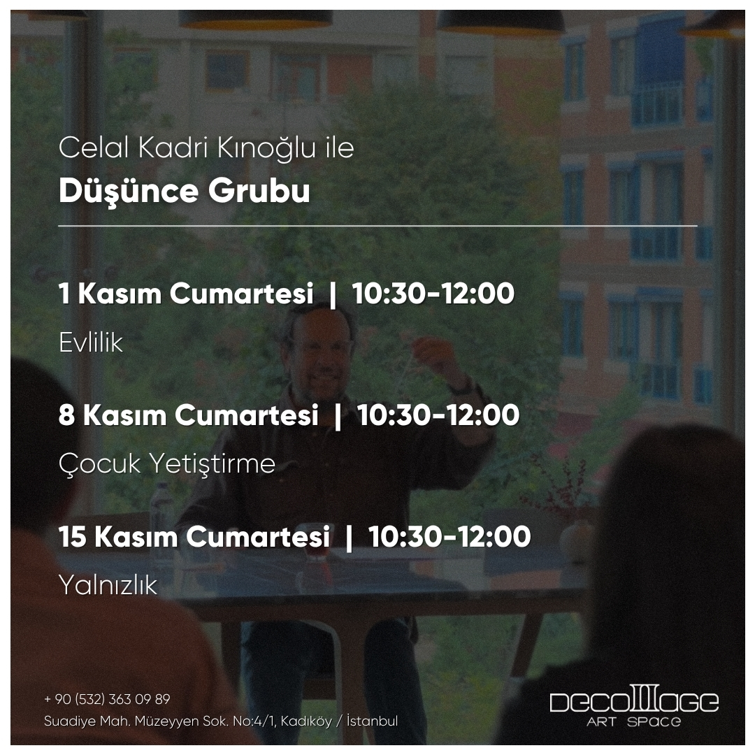 Her Cumartesi 10:30’da başlayacak Düşünce Grubumuz, hayatı sorgulama sanatı olarak da görülebilir. Decollage Art Space'te gerçekleşecek Düşünce Grubu buluşmaları, hayatı anlamlandırma yolculuğunuzda size entelektüel bir yol arkadaşlığı sunuyor.