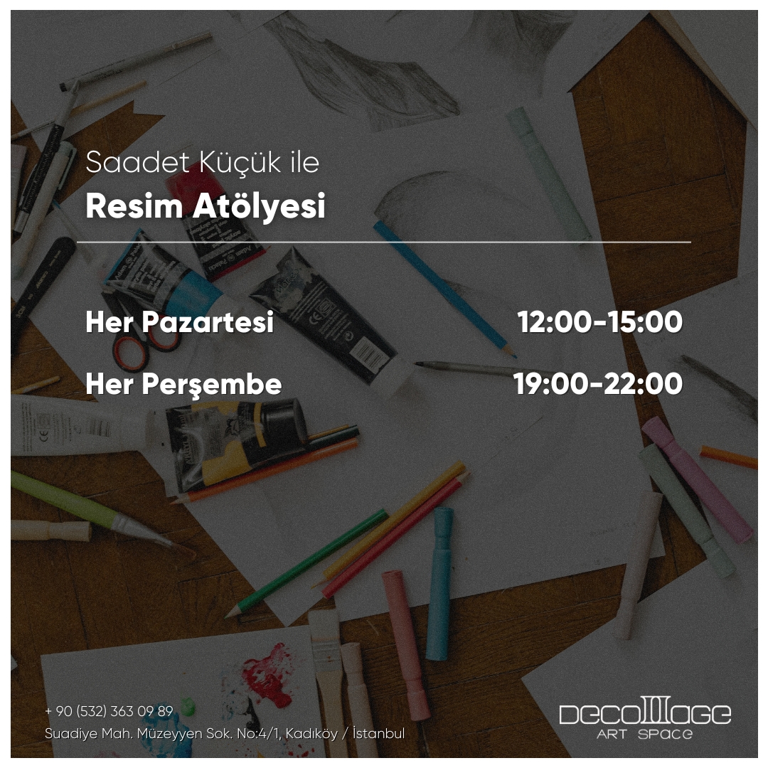 Sıfırdan boyama ve çizim temelli bu atölyemiz resme ilgisi olup daha önce hiç bu alanda deneyim sahibi olmayanlar için özel olarak hazırlandı. Resim konusunda size bir temel kazandırmak ve daha ileri seviye atölyeler için gerekli teknik bilgi ve pratiği sağlamayı amaçlayan Saadet Küçük ile Resim Atölyesi her Pazartesi ve Perşembe Decollage Art Space’te sizi bekliyor.
