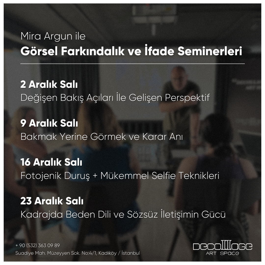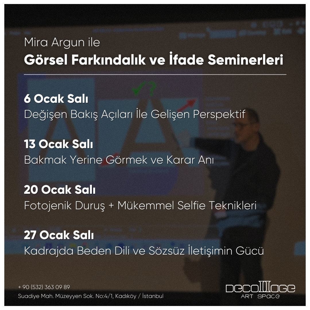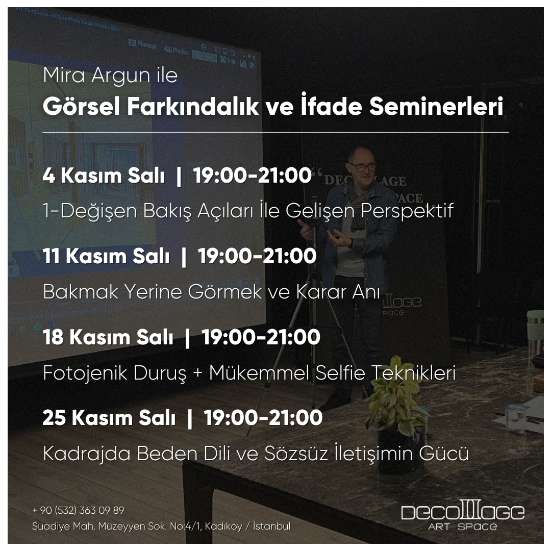 Decollage Art Space olarak hazırladığımız Görsel Farkındalık ve İfade Seminerleri serisi ile sizi fotoğraf, beden dili ve kompozisyonun derinliklerine davet ediyoruz. Her hafta farklı bir konunun işleneceği bu atölye programı hem yeni başlayanlar hem de görsel anlatım yeteneğini geliştirmek isteyenler için benzersiz bir yol haritası sunuyor. "Bakmak Yerine Görmek" felsefesiyle yola çıkarak, kamera lensinizin ardındaki yaratıcı potansiyelinizi açığa çıkarmaya hazır olun!