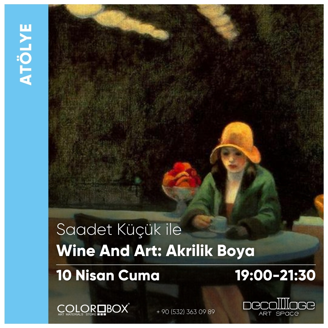 Wine and Art: Akrilik Boya Atölyemizde usta ressamların eserlerini yeniden yorumlayacağız. Eserlerdeki ilgi çeken detayları konuşacağımız bu atölyede 1 kadeh şarap eşliğinde resim yapacak ve usta ressamların renklerini keşfedeceğiz.